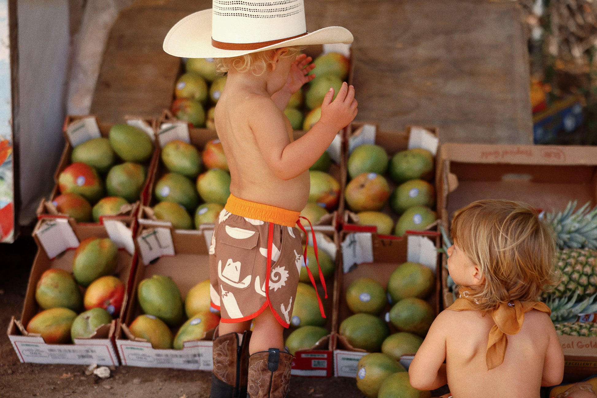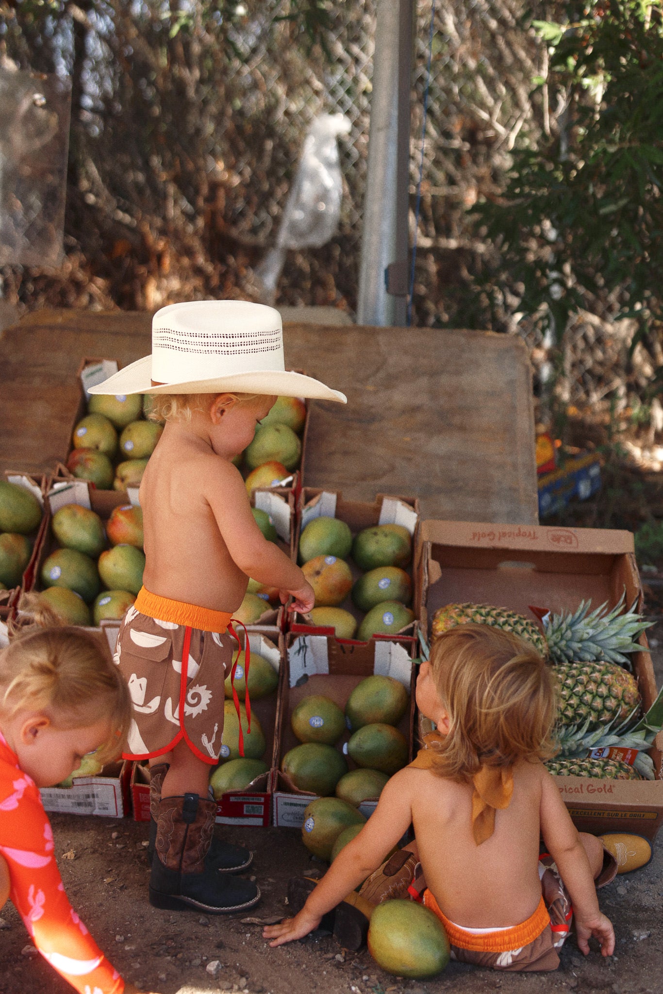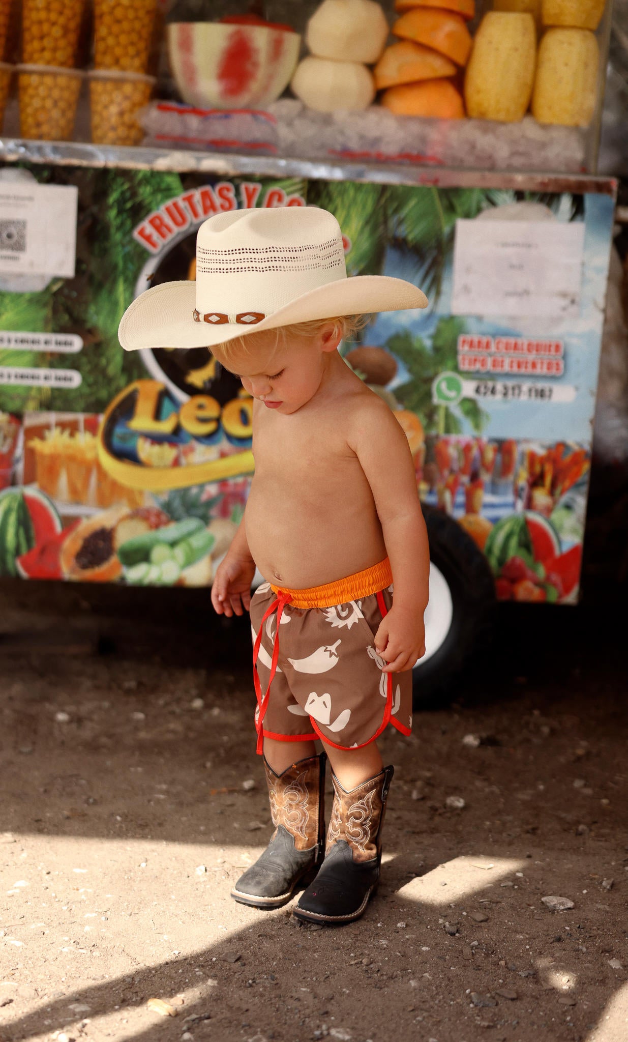 Cowboy hat boy is wearing size 2-3Y and is age 2.