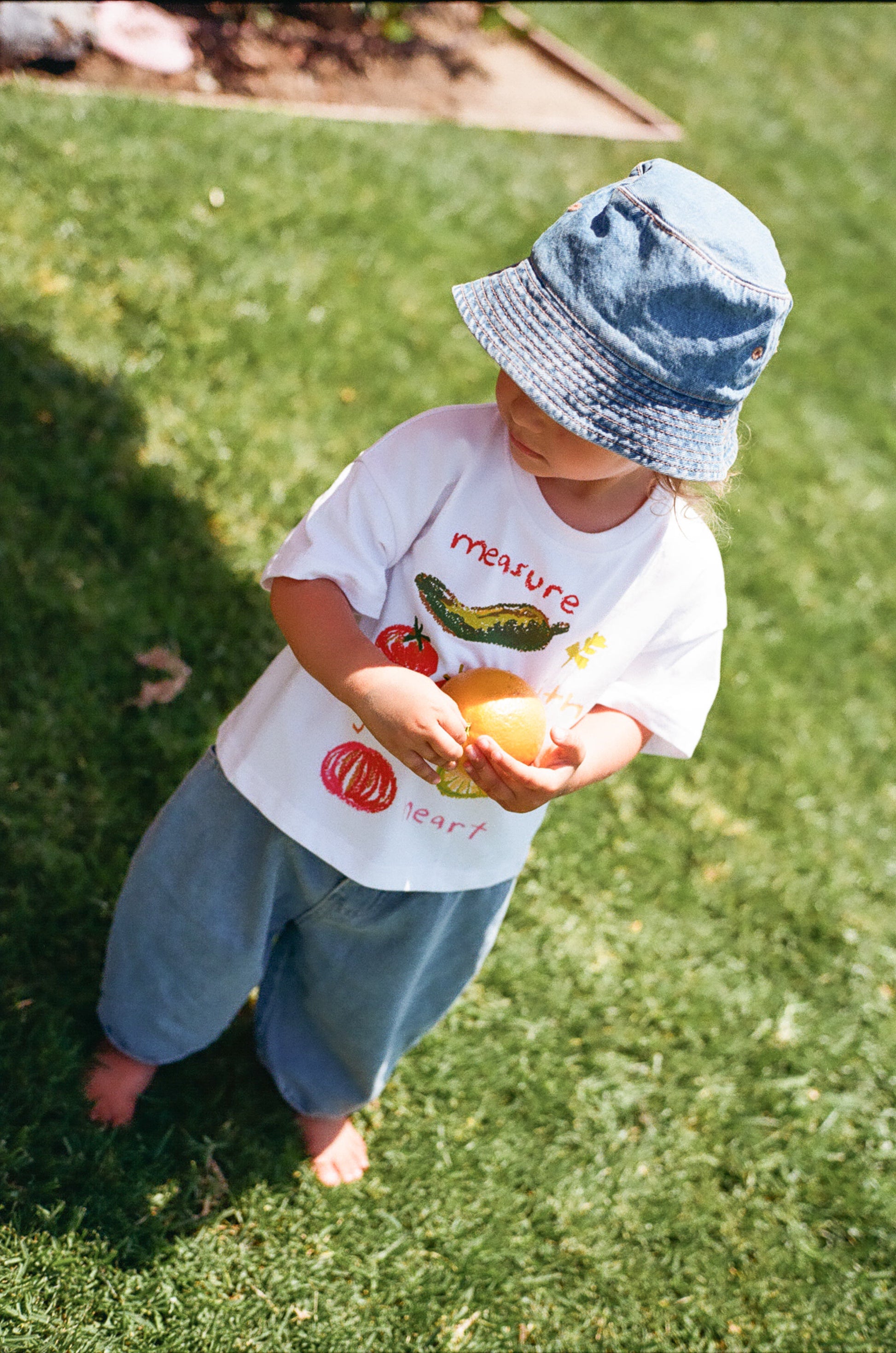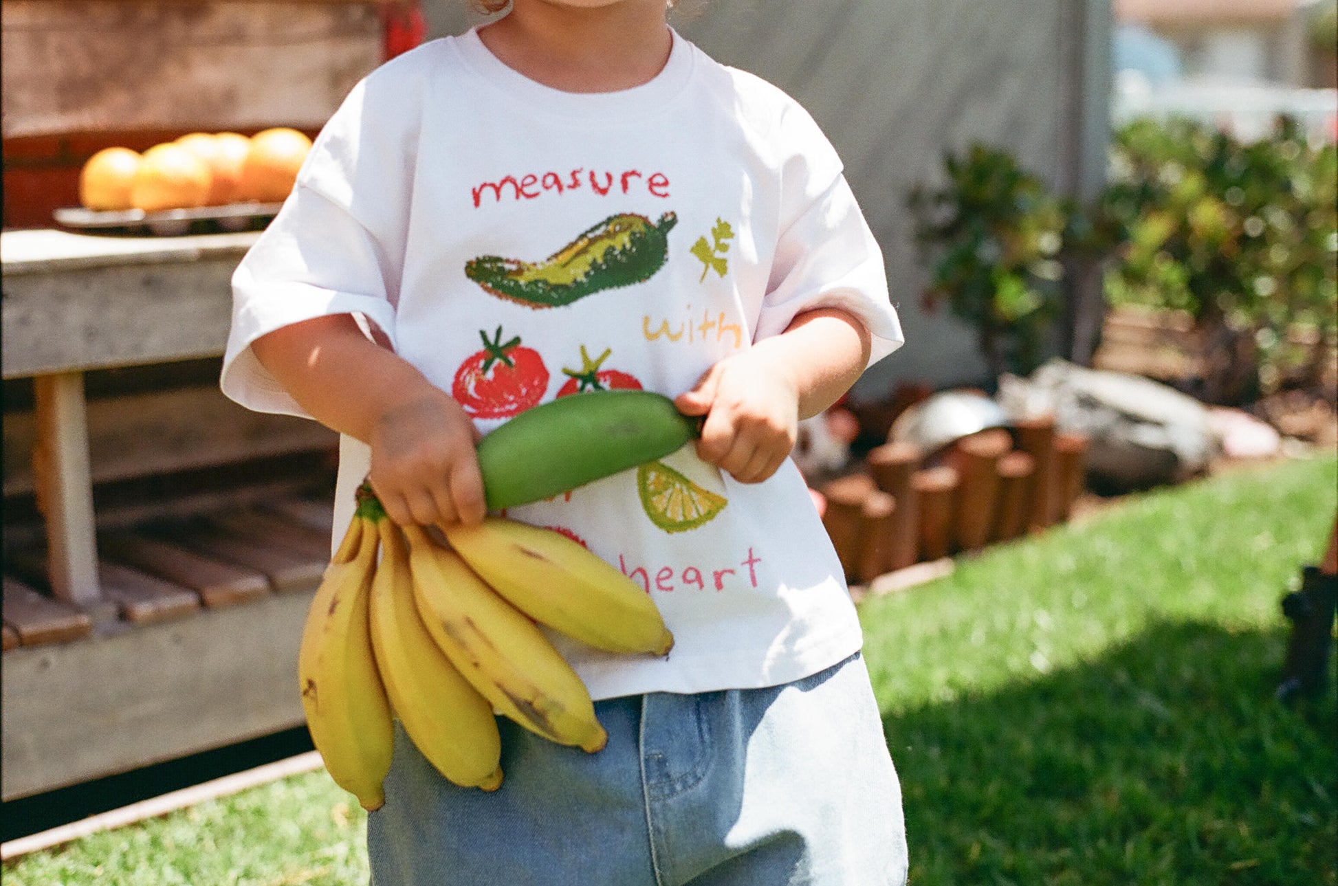Kid in photos holding fruit and the girl are both wearing size 3Y and are 3 years old.